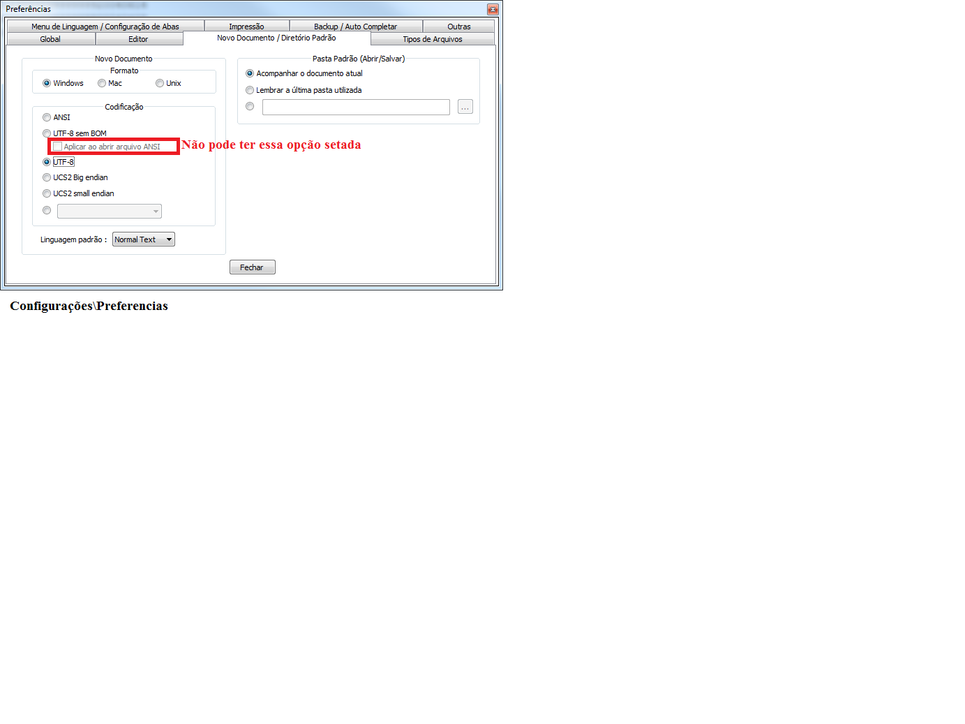 Veja o print em anexo mostrando o que precisa alterar. Entre no notepad ++ no menu Configurações/Preferências e faça a configuração conforme mostra o print.