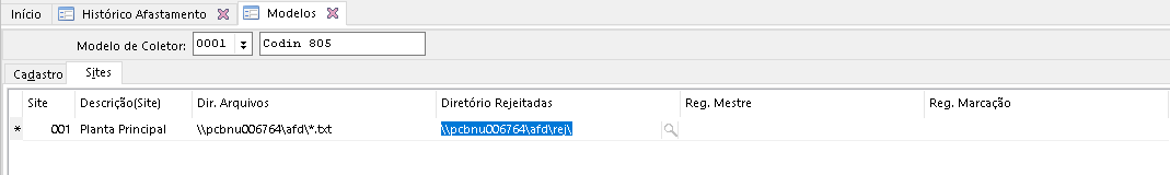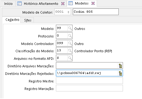 -O campo Diretório Arquivo de Marcações da aba Cadastro deve ficar em branco.