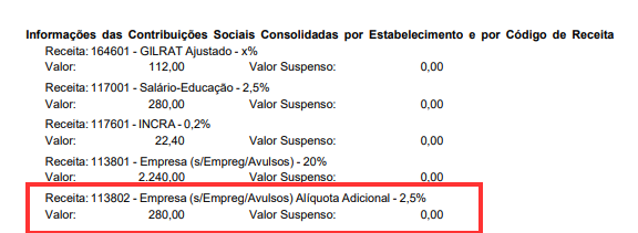 No momento de listar o S-5011, deve-se atentar que o eSocial calcula a receita de 20% no código 113801 e o Adicional de 2,5% na receita 113802. Ou seja, a parte empresa será demonstrada mais de uma vez, separando os percentuais para cada receita.