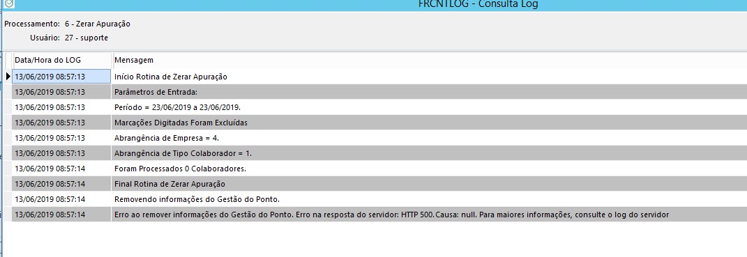 Ao clicar no log, é possível verificar que é exibido o seguinte erro: Erro ao remover informações do Gestão do Ponto.Erro na resposta do servidor: HTTP500.Causa: null. Para maiores informações, consulte o log do servidor.