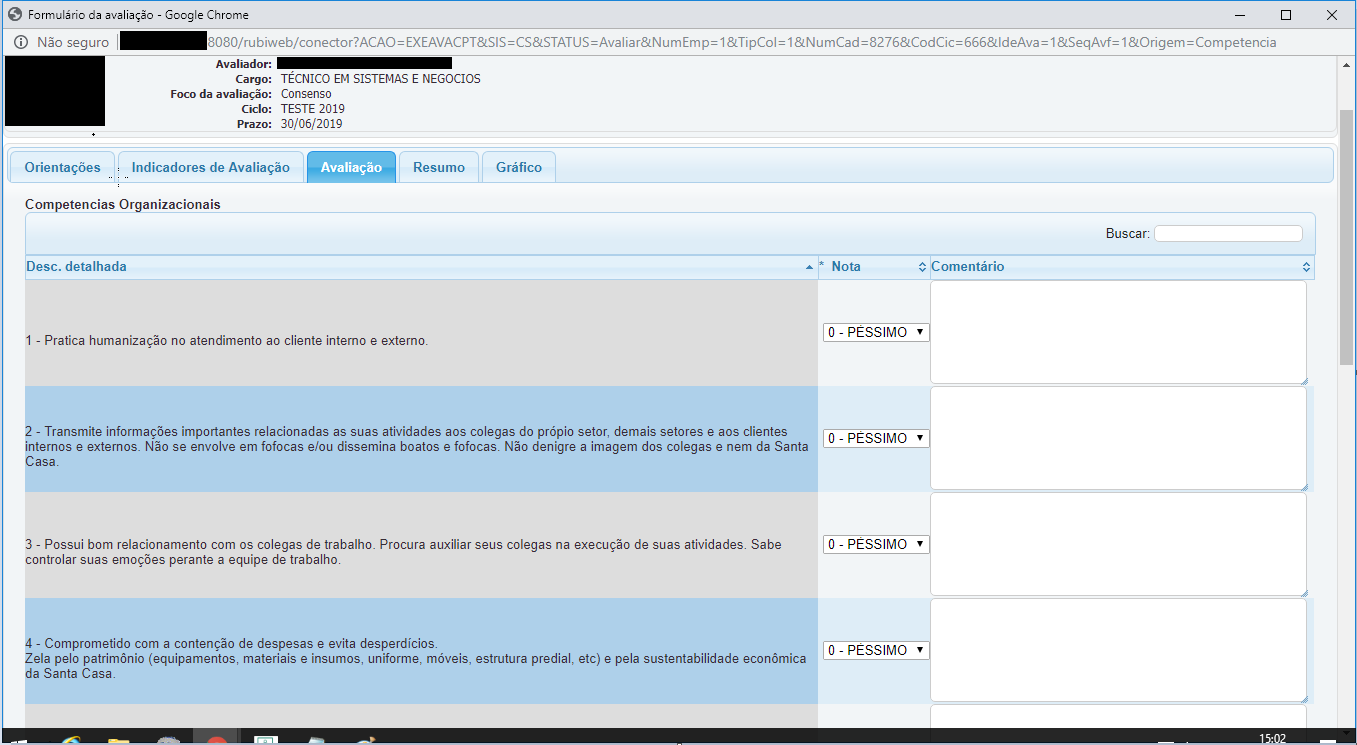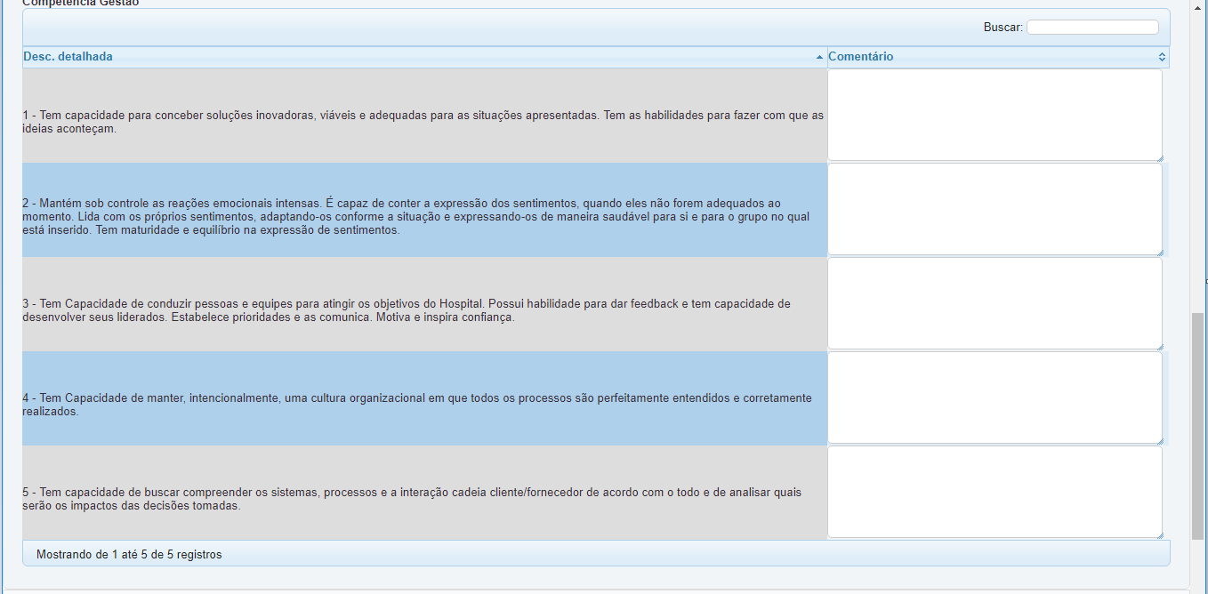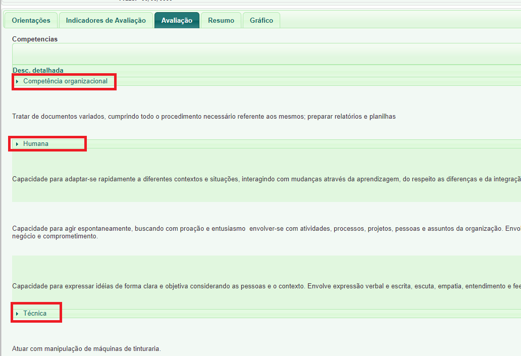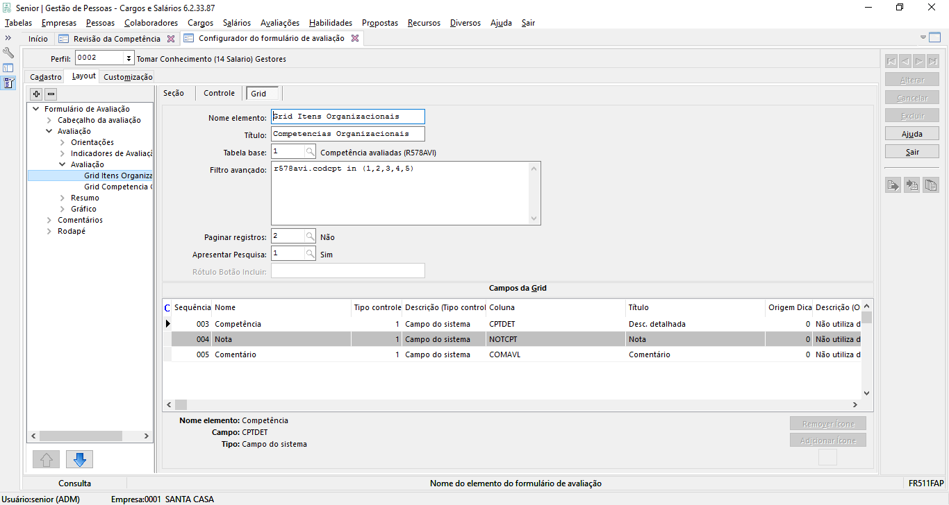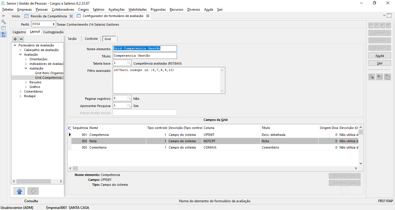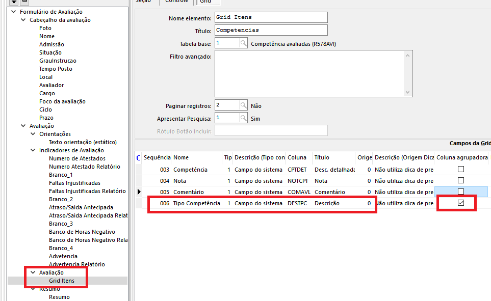 Para evitar que sejam acrescentadas grids para dividir as competências na avaliação, é possível utilizar o campo coluna agrupadora no perfil, com isso, na mesma grid as competências podem ser agrupadas conforme o campo definido.