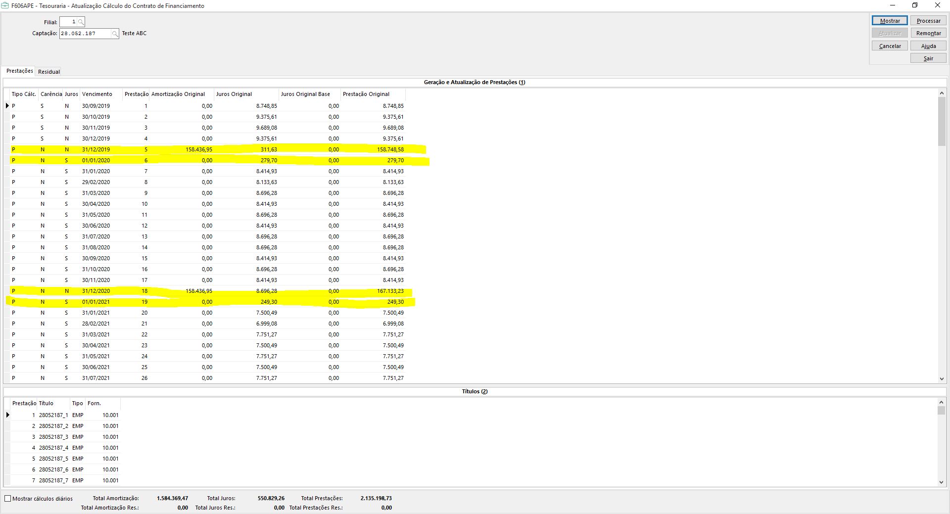 Diante desse cenário é gerada a primeira amortização para a data 31/12/2019 e uma prestação de juros para a data 01/01/2020.