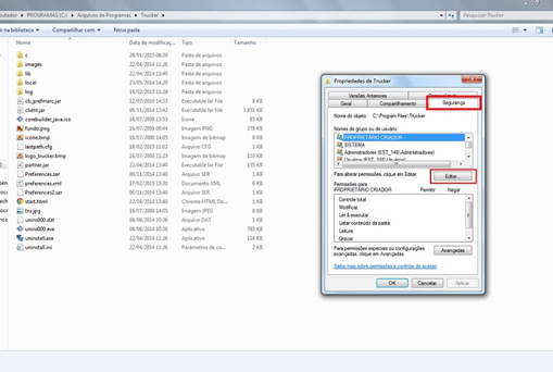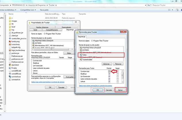 O próximo passo é, já de volta a primeira tela aberta, a tela de Permissões para Trucker, selecionar a opção Todos, e marcar a opção Controle Total, clicar em Aplicar, e depois em OK conforme imagem abaixo.