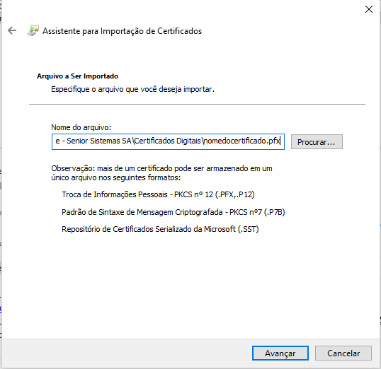 Segue em anexo um passo a passo com a maneira que o certificado foi instalado na Senior, onde conseguimos gerar as informações corretamente sem a mensagem.