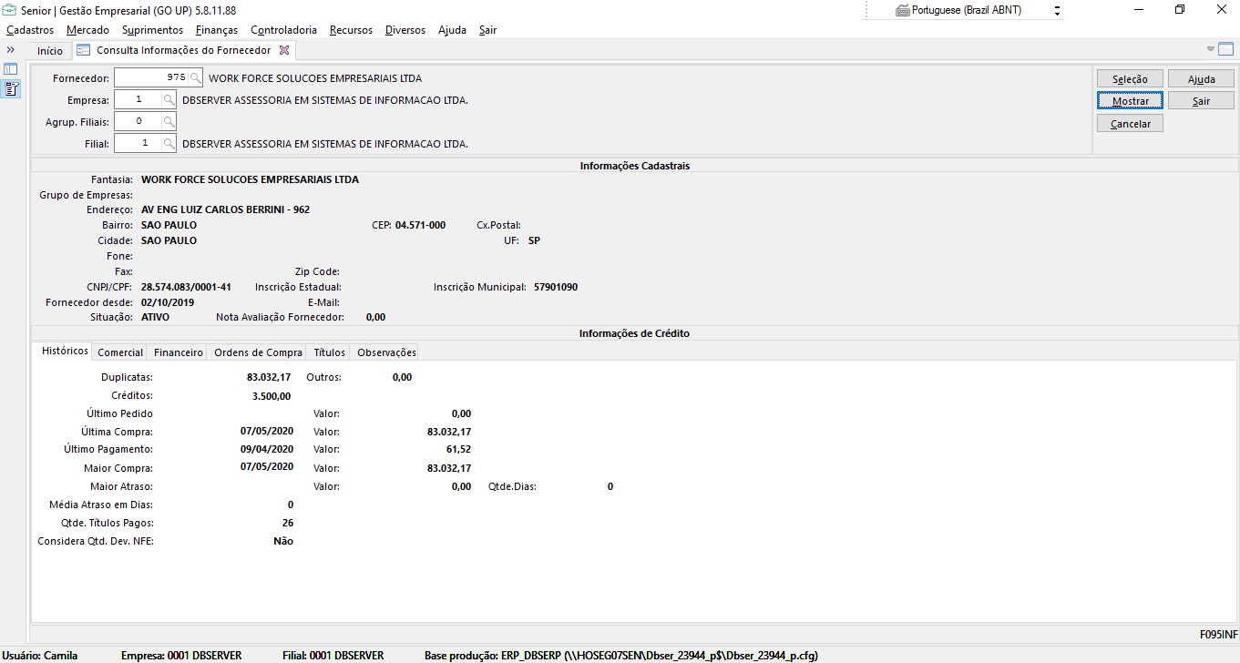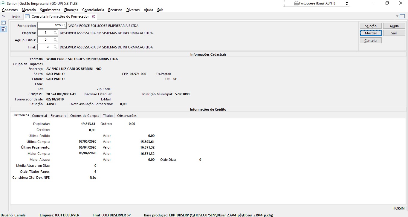 Rotina / Tela: F095INF - Cadastros / Clientes e Fornecedores / Fornecedores / Consultas / Informações de Fornecedores