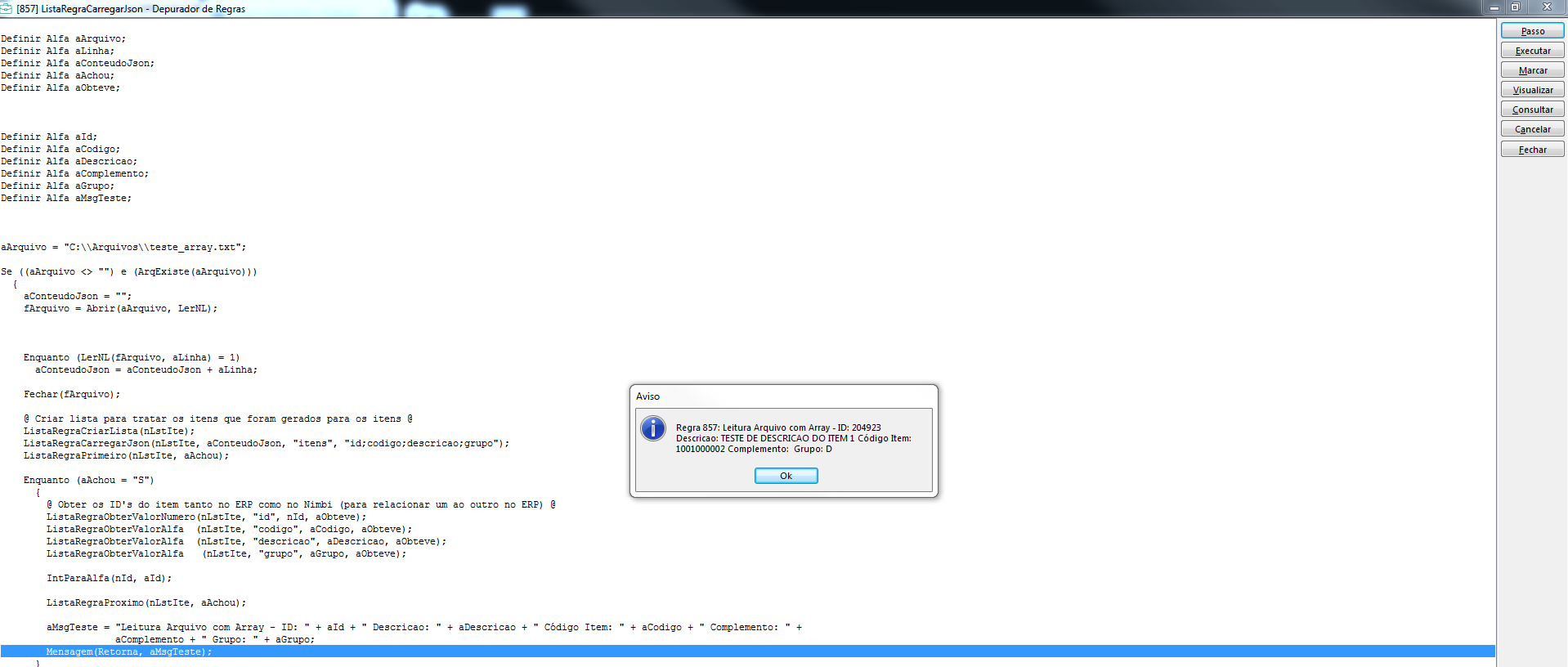 Depois de feito esses ajustes, poderá executar a mesma pelo menu Recursos/Implementações/Regras/Editar. Coloque o depurador ativo, salve e em seguida execute