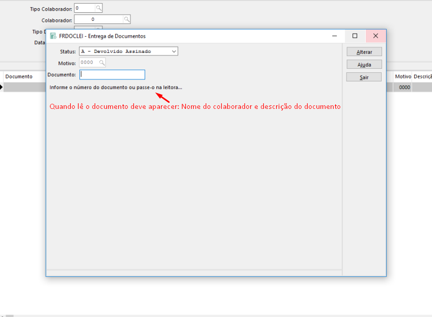 Nesta tela, quando ocorre a leitura do documento deve aparecer Nome do colaborador e tipo de documento.