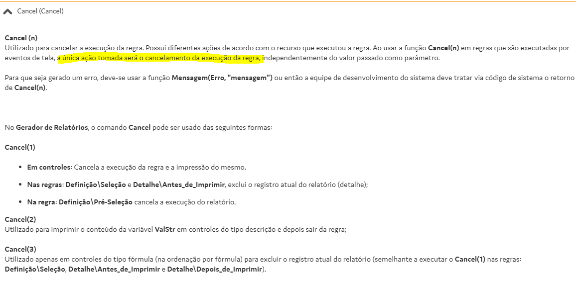 Caso queira dar uma mensagem e em seguida cancelar, deverá ser utilizada função Mensagem no qual exibe uma mensagem para o usuário em tela, onde <tipo da mensagem> podem ser os seguintes: