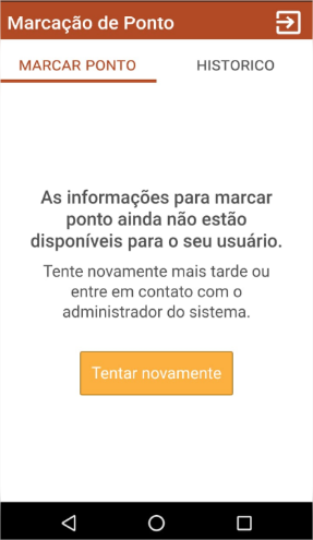 Ao efetuar login no aplicativo Marcação de Ponto 1.0 é exibida a mensagem "As informações para marcar ponto ainda não estão disponíveis para o seu usuário", conforme abaixo: