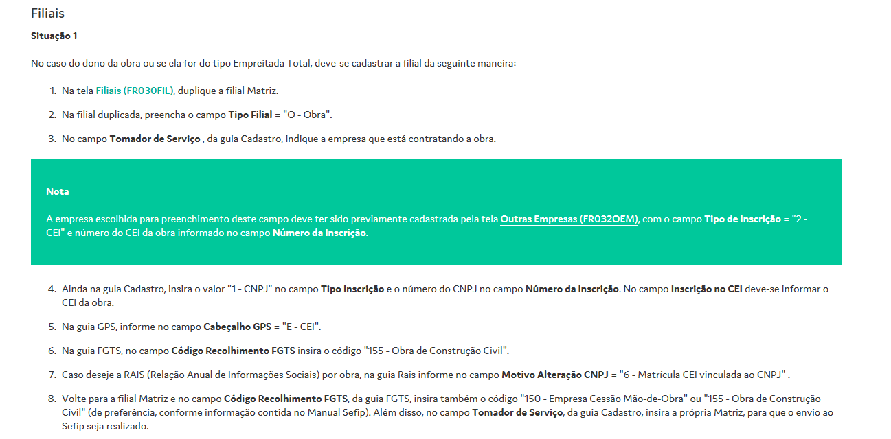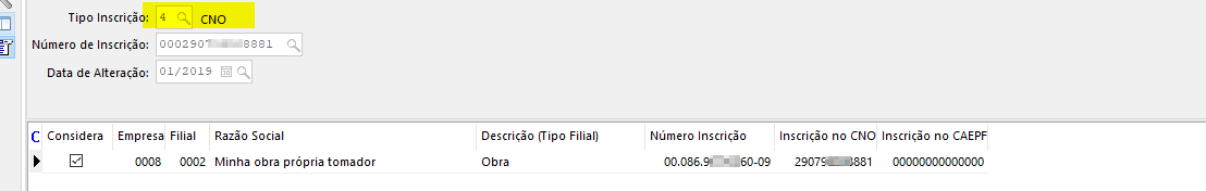 Terá que cadastrar outra empresa com o CNO da Obra e indicar como tomador na filial Obra.