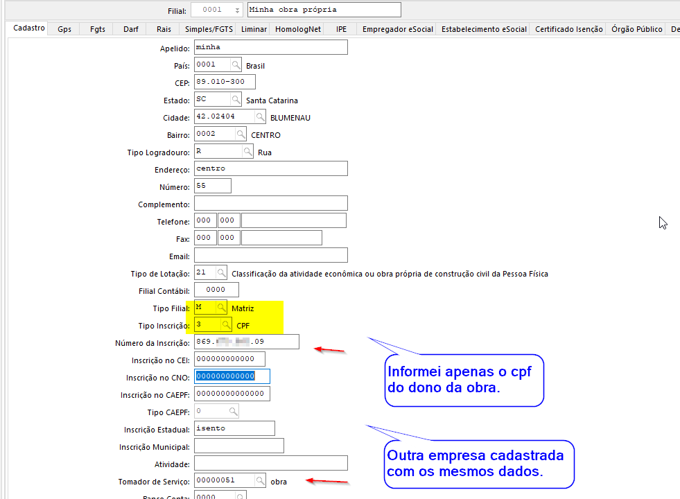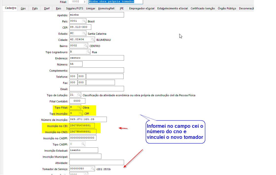3. Duplicar esta filial matriz e cadastrar com os mesmos dados a obra, informando agora o cno e o tomador: