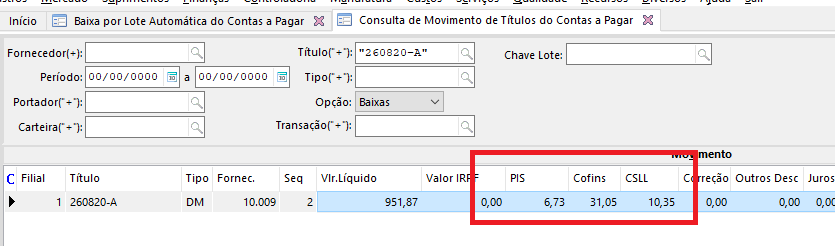 Verificar como é feito o cálculo do Pis, Cofins e CSLL na baixa título com estas condições.