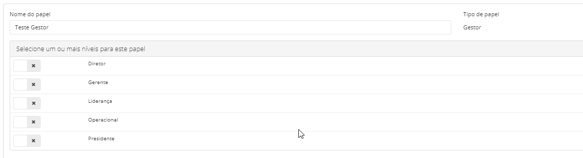 O papel será aplicado para os níveis selecionados, caso algum nível não seja selecionado, será aplicado o papel Gestor padrão do sistema.