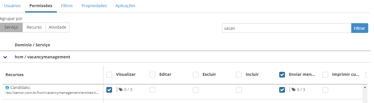 3. Clique na Aba Permissões, selecione a opção agrupar por Recurso;