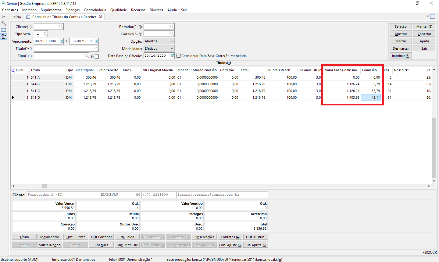 No caso do cliente, temos 4 parcelas (Comissão Primeira Parcela = N) com as seguintes comissões sendo geradas atualmente: