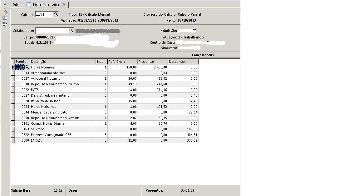 Quando ocorre / onde se aplica: Cálculos > Efetuar Cálculo e Cálculos > Ficha Financeira > Cadastro
