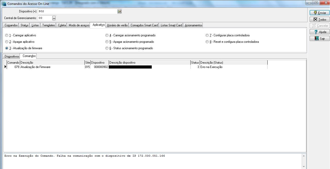 No Ronda XT, ao enviar um comando para Atualizar o Firmware do dispositivo, é apresentada a mensagem: Erro na Execução do Comando. Falha na comunicação com o dispositivo de IP XX. No log do driver (DDG) não é exibida mensagem alguma com o IP deste dispositivo, mesmo os logs estando em nível TRACE.