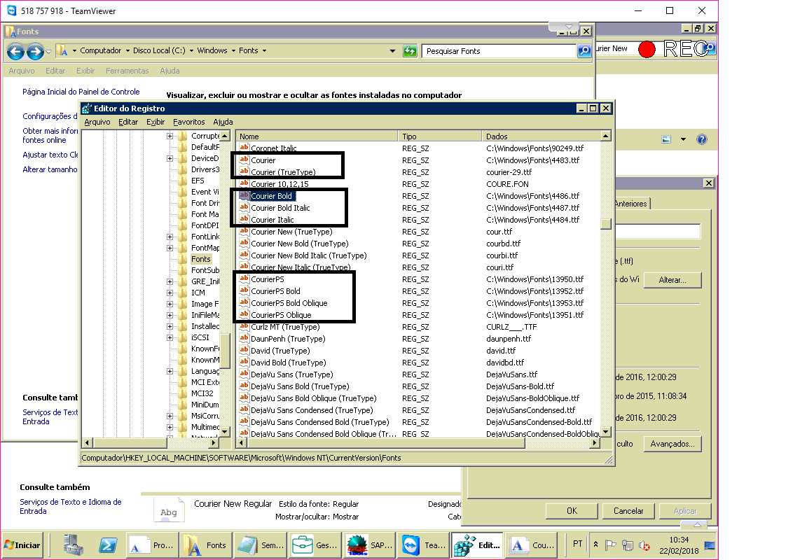 Remover no REGEDIT estas fontes indevidas e deixamos apenas Courier 10,12,15, Courier New (TrueType), Courier New Bold(TrueType), Courier New Bold Italic(TrueType) e Courier New Italic (TrueType), conforme print anexo.