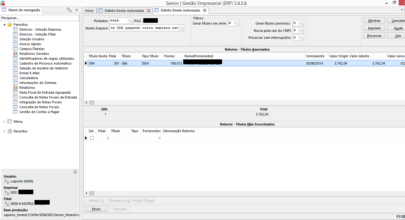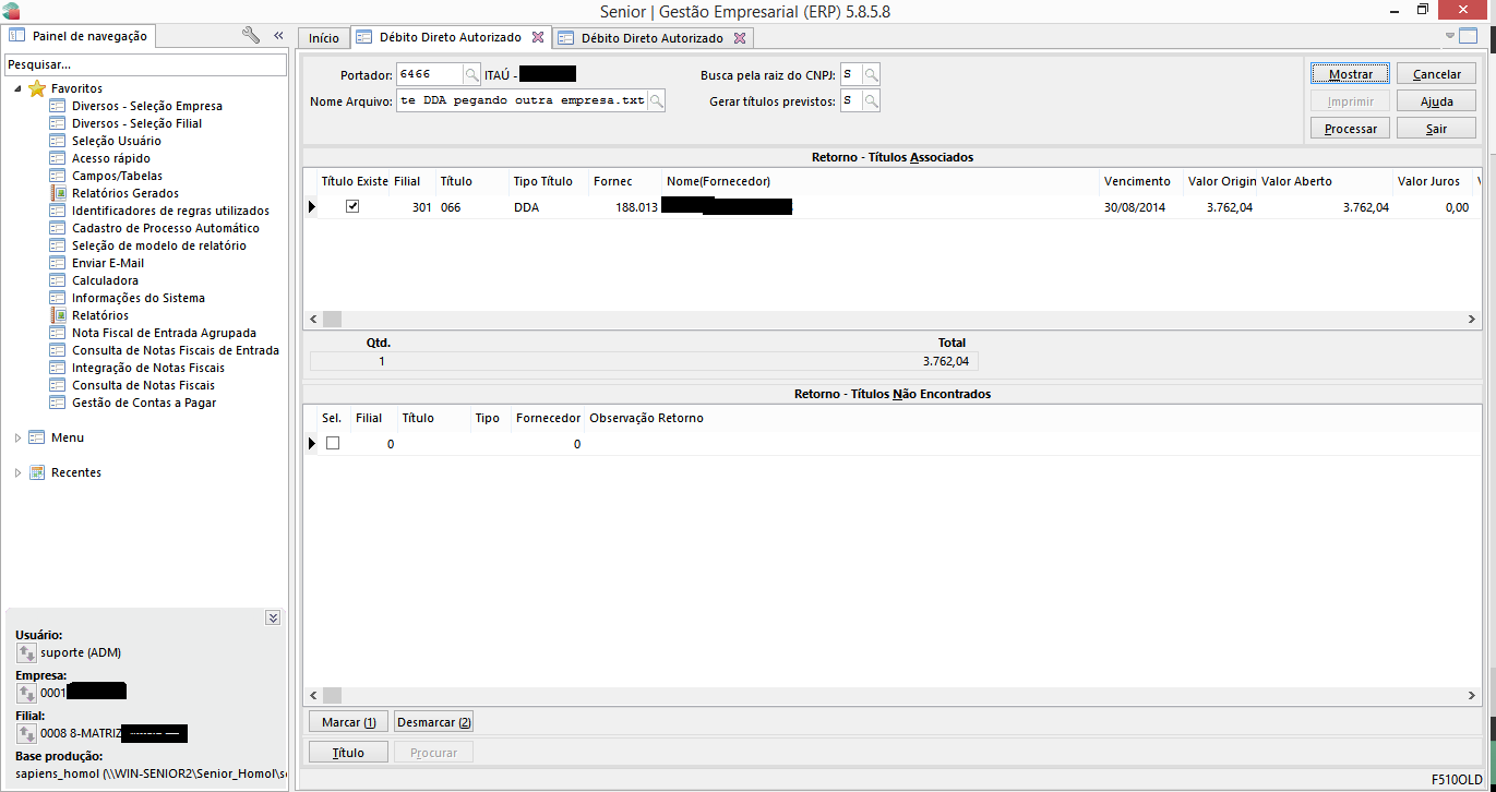 Problema: Na tela F510DDA ao escolher o arquivo e mandar mostrar, o sistema sugere para efetivação títulos de outras empresas.