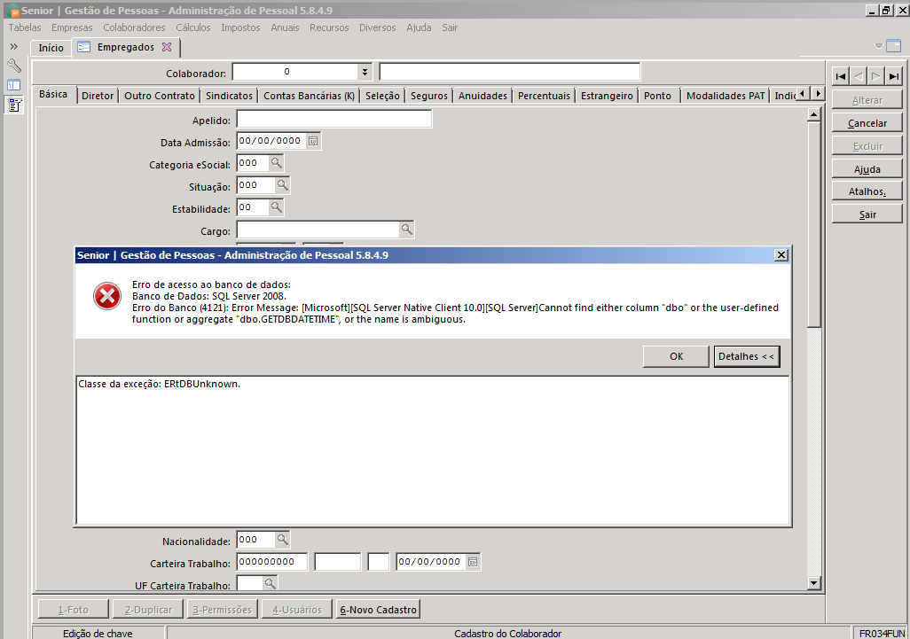 Problema: Ao consultar colaboradores no sistema, ocorre a mensagem abaixo: