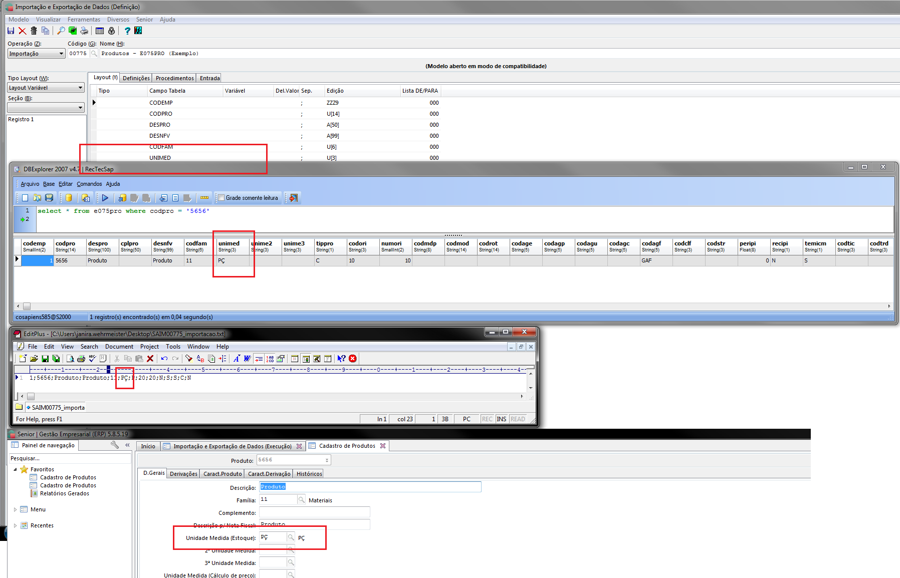 Observação: No caso aciona, a importação ocorreu na tabela E075PRO - campo UniMed, porém essa situação pode ocorrer em qualquer Tabelo/Campo do sistema.