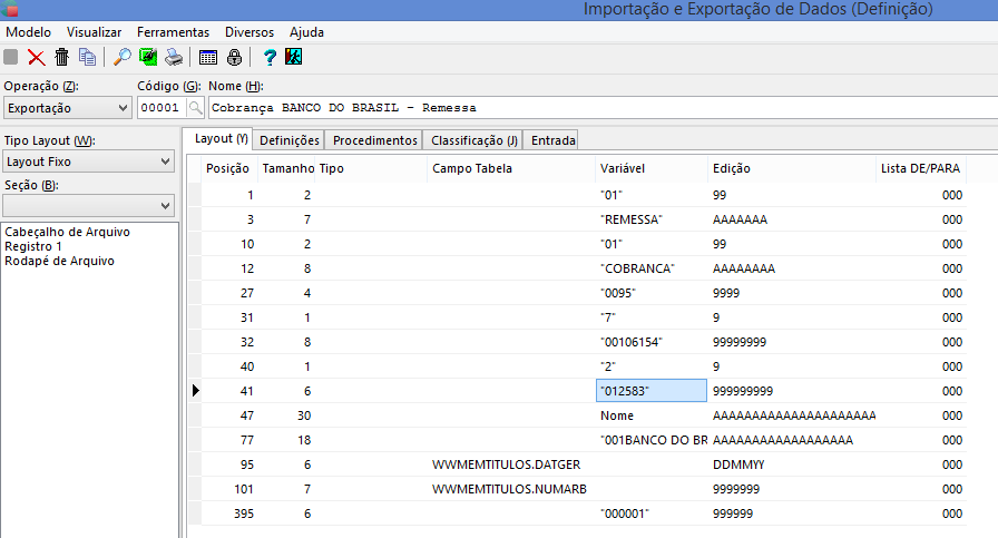 Problema: Ao parametrizar a cobrança escritural, foi verificado que o layout de remessa do Banco do Brasil 001 padrão do Sistema para envio do arquivo esta com campos fixados, o que inviabiliza o uso pelo cliente.