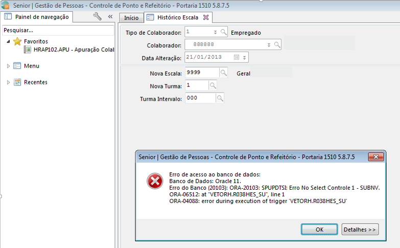 Problema: Ao realizar alterações nos históricos de colaboradores, ocorre erro no sistema. Segue exemplo da mensagem encontrada: