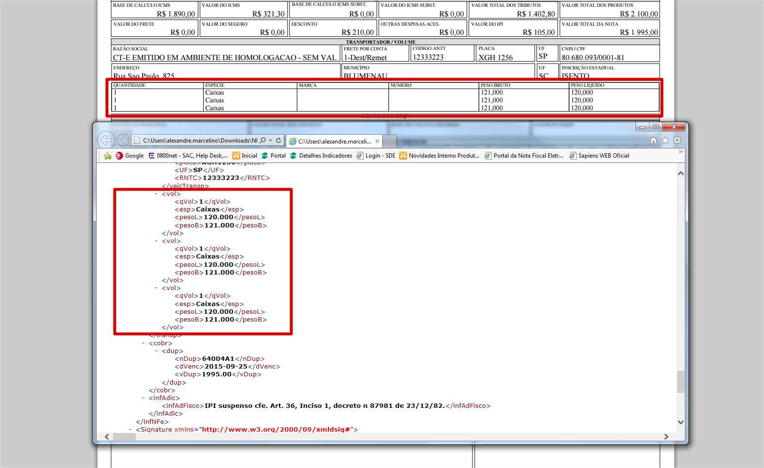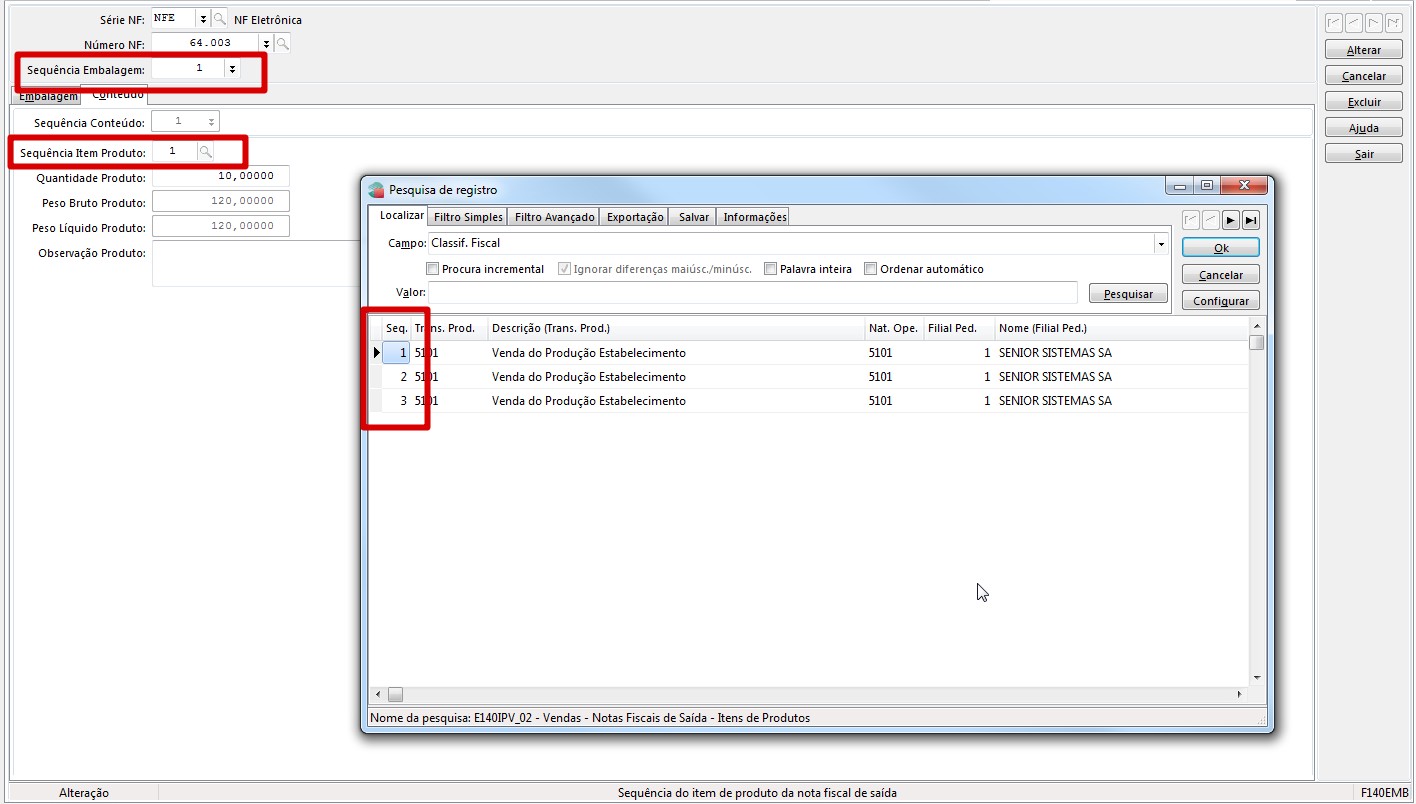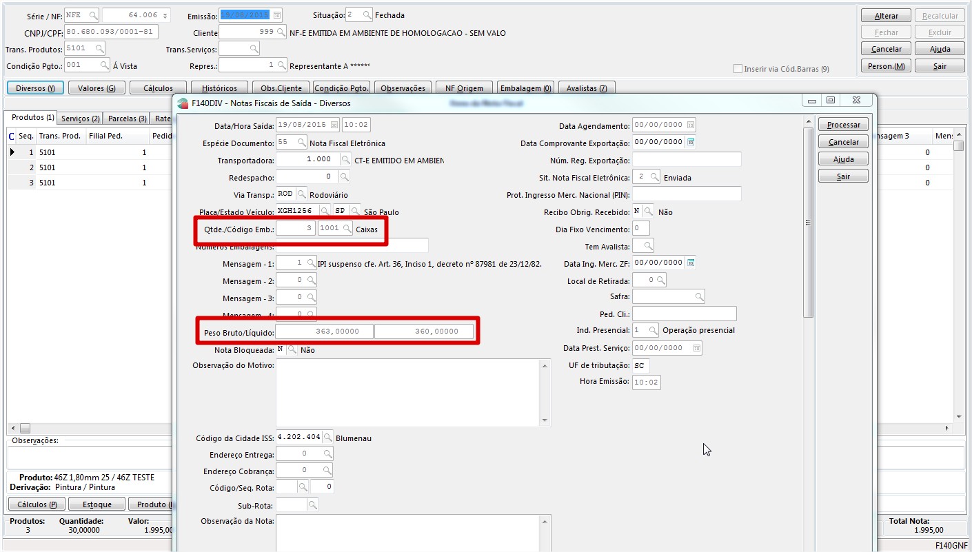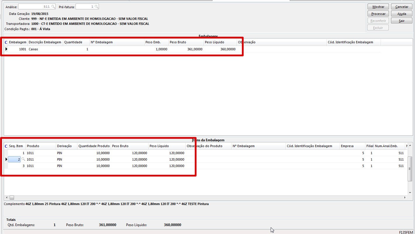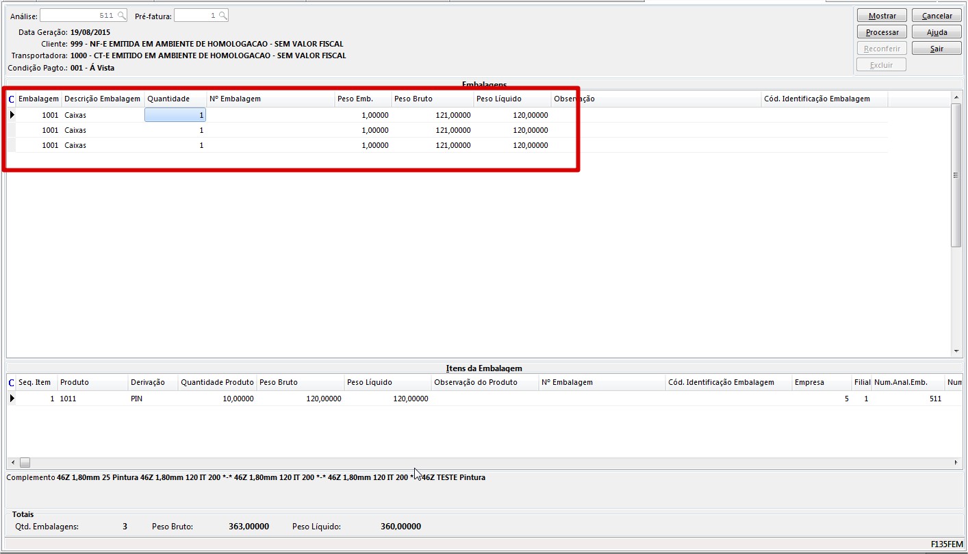 Solução: Solução 15342: A geração as informações de embalagens no XML, que consequentemente serão impressas na DANFE dependem de como o cliente gera as embalagens na pré-fatura ou NF. Se na formação das embalagens na pré-fatura na tela F135FEM o cliente inserir na grid Embalagem uma embalagem para cada item (uma sequência para cada item), fazendo o relacionamento dessa embalagens na grid Itens da Embalagem (conforme exemplo em anexo F135FEM_Embalagem.jpg), no momento de gerar a NF, o sistema irá inserir na tabela E140EMB (tabela que gravas os dados da embalagem da NF) também uma sequência de embalagem para cada item (conforme exemplo em anexo F140EMB.jg), com isso, na geração do XML, serão gerados as informações da embalagem para cada item em separado, fazendo com que na impressão da DANFE seja impresso as três embalagens, conforme exemplo em anexo (XML X DANFE.jpg).