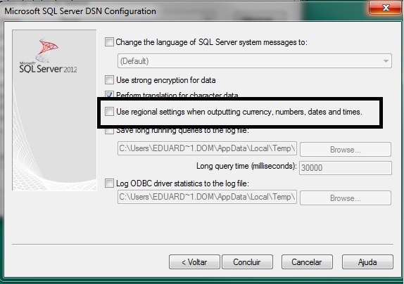 Deve ser adicionado na documentação uma orientação para não habilitar o check box conforme anexo(Configuracao_odbc).