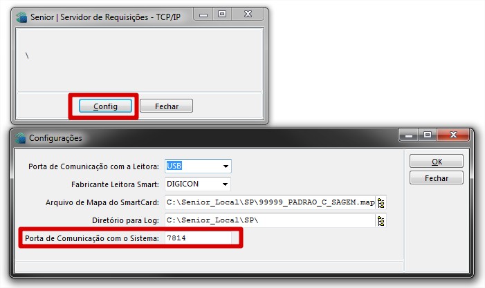 Caso alterado a porta de comunicação padrão da aplicação (7777), o valor configurado deve ser somado com 37 e adicionado este resultado no campo Porta de Comunicação com o Sistema no SRVTCP, eivdência anexa.