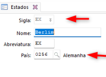 2. Cadastre o estado EX na tela F007UFS - Cadastros / Localização / Estados e informe de qual país pertence: