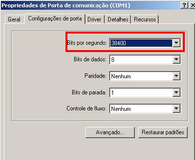 2.4. Localize a Porta (COM & LPT) em questão e, em Propriedades / Configurações de porta, ajuste o campo Bits por Segundo para 38400: