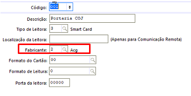 2. Configure a leitora com Fabricante 2- ACG, conforme demonstrado na imagem a seguir: