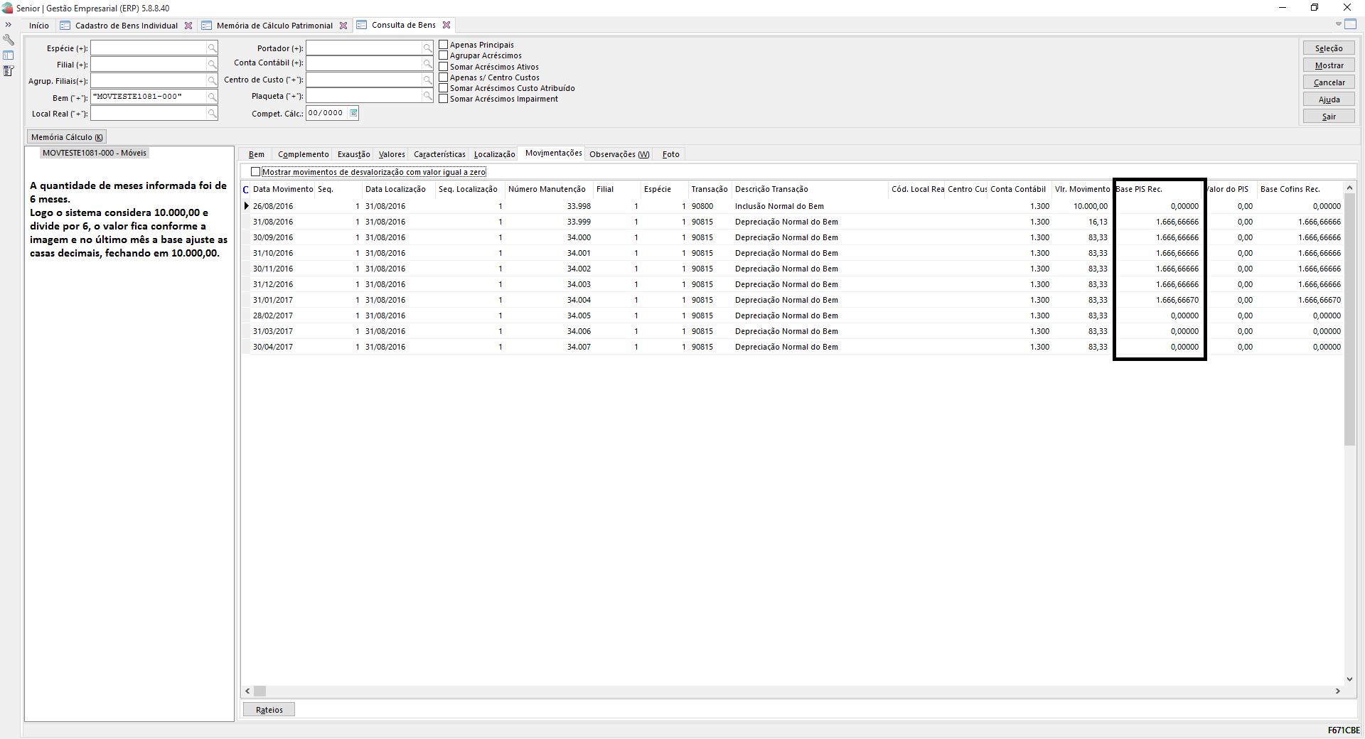 Esta situação ocorre quando a quantidade de meses para recuperação de PIS e COFINS é maior que 1, onde o sistema divide a base e apura em mais casas decimais, ao realizar cálculo do último mês previsto, o sistema faz o ajuste do valor.