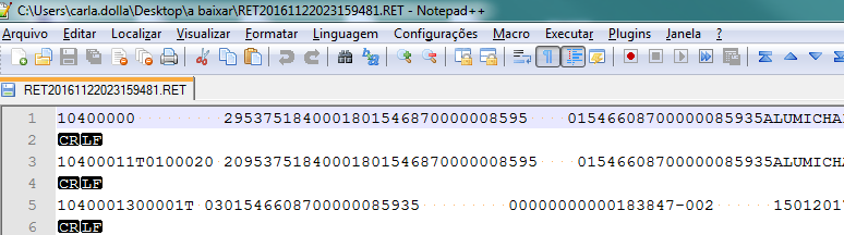 1. Abra o arquivo de retorno no notepad do Windows e verifique se existe um caracter especial, caso exista é necessário excluir o caracter;