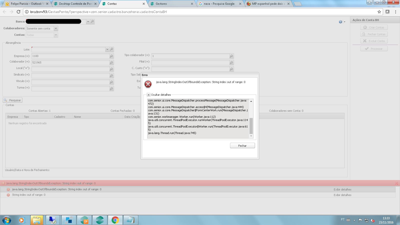 Problema: Ao procurar por qualquer colaborador sem conta em banco de horas no gestão de ponto, está ocorrendo o erro: