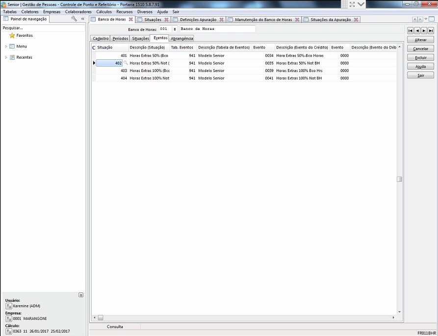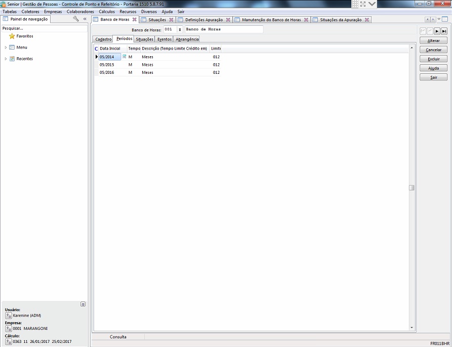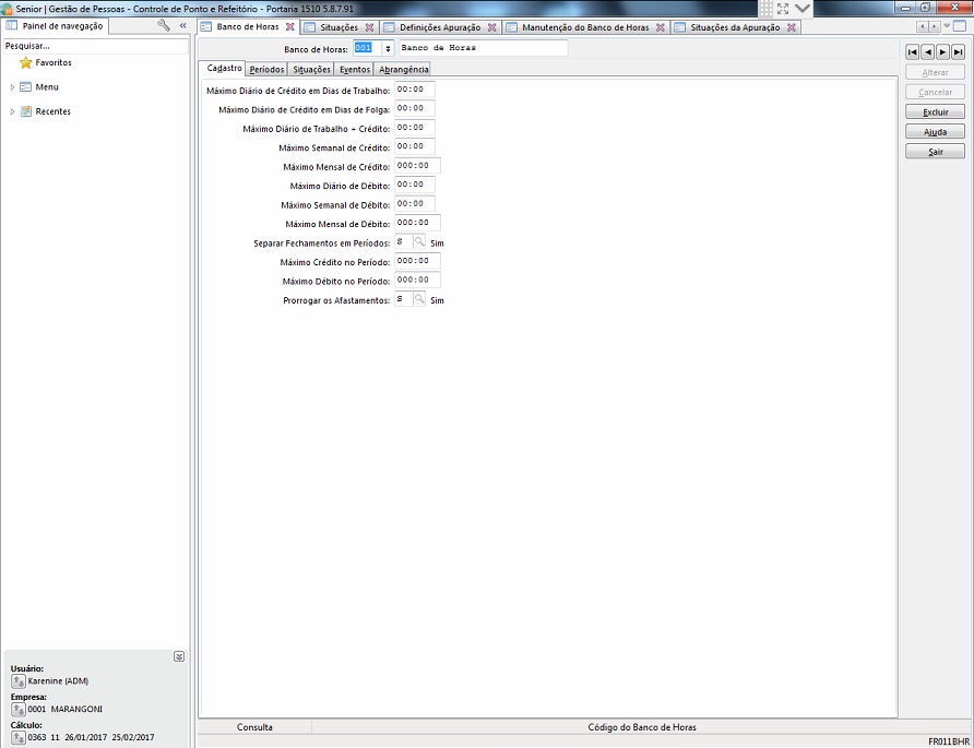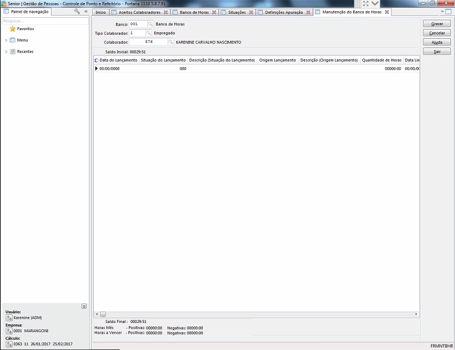 Rotina / Tela: Cálculo > banco de horas > lançamentos > manutenção