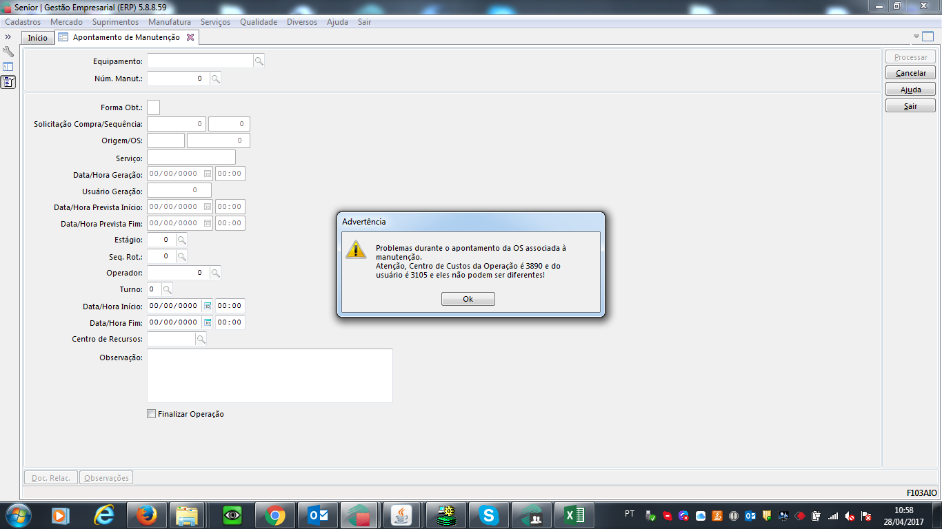 Problema: Precisamos realizar o apontamento de ordens de manutenção na tela f103aio