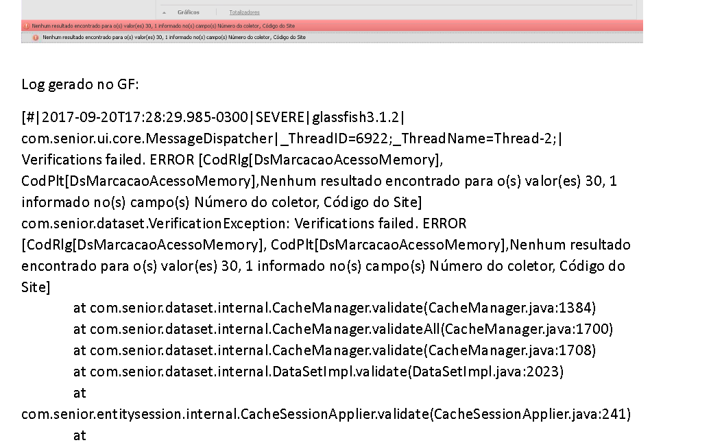 [#|2017-09-20T17:28:29.985-0300|SEVERE|glassfish3.1.2|com.senior.ui.core.MessageDispatcher|_ThreadID=6922;_ThreadName=Thread-2;|Verifications failed. ERROR [CodRlg[DsMarcacaoAcessoMemory], CodPlt[DsMarcacaoAcessoMemory],Nenhum resultado encontrado para o(s) valor(es) 30, 1 informado no(s) campo(s) Número do coletor, Código do Site]