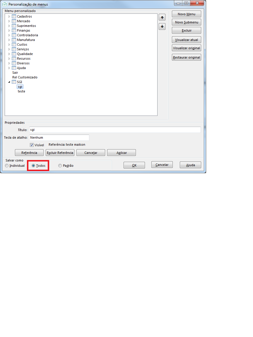 Solução 20559: Após criar a tela SGI, precisa incluir em um sub menu Personalizadas. Então é primordial os usuários terem acesso a esse menu. Em seguida poderá criar um menu personalizado através da Personalização de menus(chave de boca) no canto esquerdo do menu do Sistema. Deverá selecionar a opção Todos, conforme pode ser visto no print em anexo. Lembrando que primeiramente sugerimos fazer a alteração em base homologação e somente após validar colocar na produção.