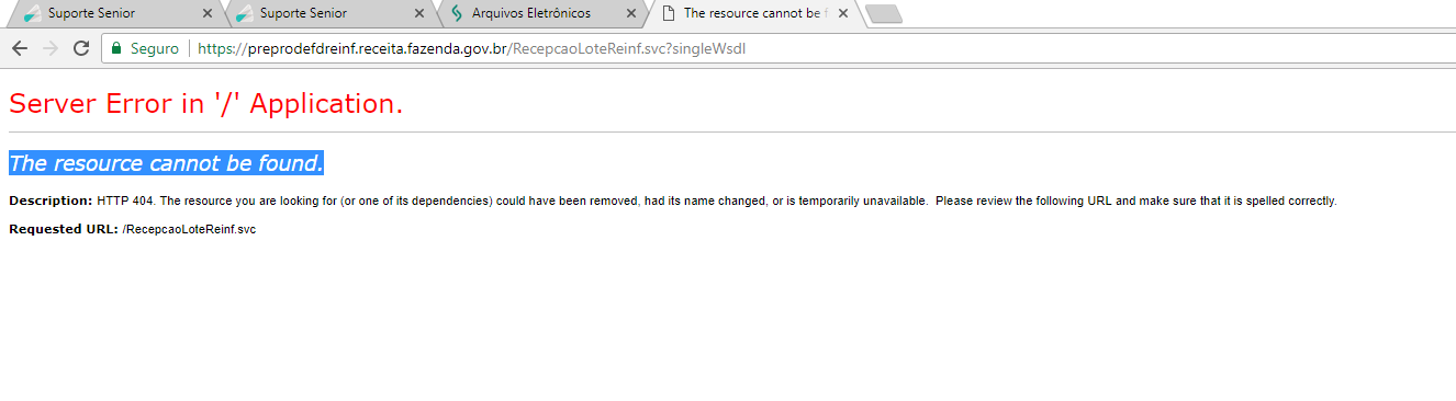 ERROR Senior.SapiensNfe.Processos.Service.Reinf.Integracao.IntegracaoBase - Ocorreu um erro ao integrar o evento do EFD-REINF. System.ServiceModel.EndpointNotFoundException: Não havia um ponto de extremidade em escuta em https://preprodefdreinf.receita.fazenda.gov.br/RecepcaoLoteReinf.svc?singleWsdl capaz de aceitar a mensagem. Em geral, isso é causado por um endereço ou ação de SOAP incorreta. Consulte InnerException, se presente, para obter mais detalhes. ---> System.Net.WebException: O servidor remoto retornou um erro: (404) Não Localizado.