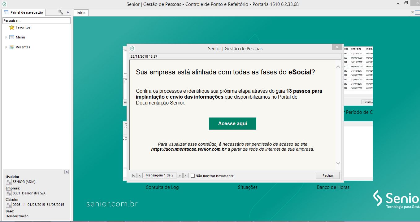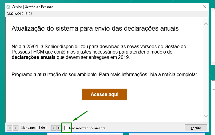 Solução: Solução 22890: A mensagem pode ser marcada como Não Mostrara Novamente no canto inferior. Caso novas mensagens sejam enviadas elas serão exibidas até seja marcado novamente a opção Não Mostrar Novamente. Não existe opção para desativar as mensagens futuras.