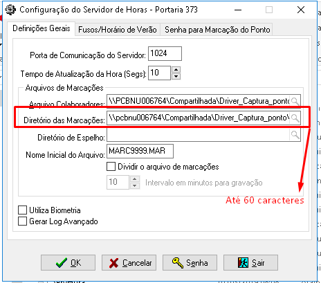 - Deve-se remover o arquivo SERVER.DPC do diretório de instalação > Acessar o ServHoraCFG e configurar um diretório com até 60 caracteres.