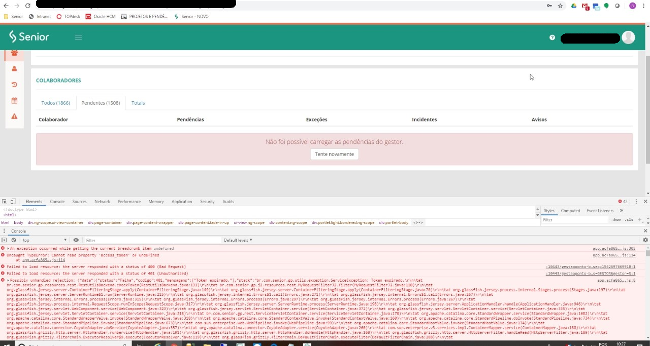 Descrição do Problema: Ocorre a mensagem Não foi possível carregar as pendências do gestor e não é carregado as pendências, totais e colaboradores na tela.