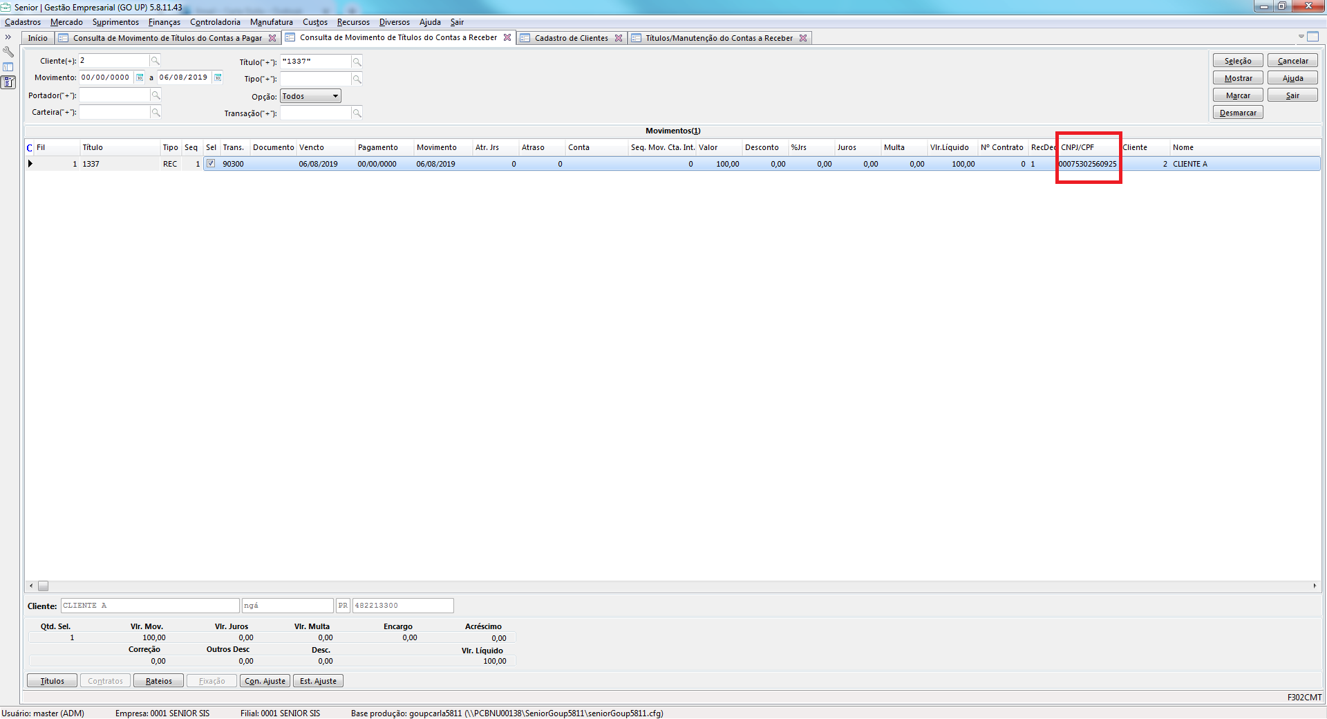 Ao acessar a tela de consulta de movimentos o campo CNPJ está trazendo a informação zerada. De onde realmente vem essa campo? Não é o CNPJ do cliente?