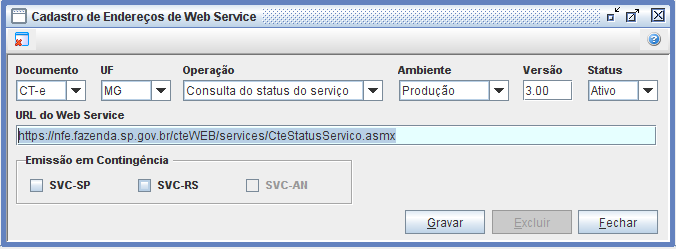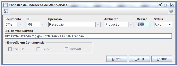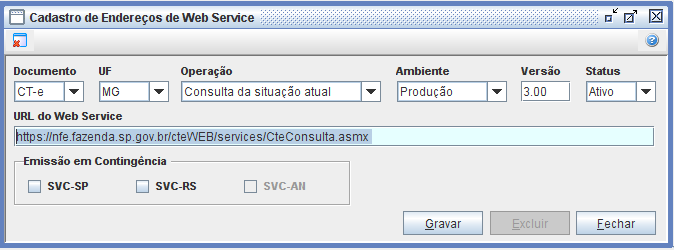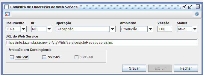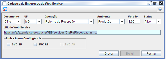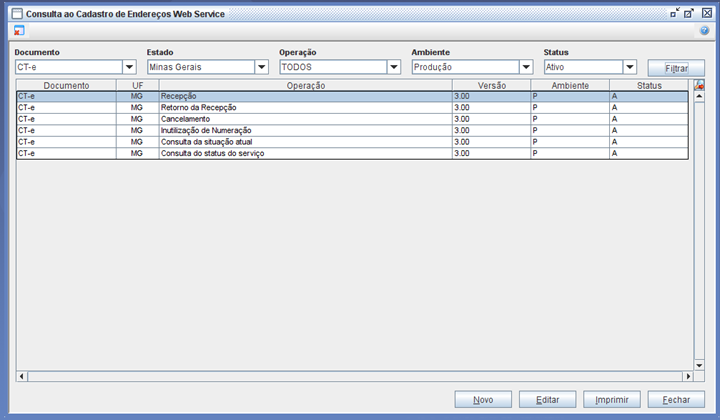 Usando como exemplo o estado de MG, para ativar a contingência no sistema, deverá acessar: Trucker->Cadastro->Fiscal->Endereços Web Service dos Documentos, filtrar pelo Documento: CT-e, Estado: Minas Gerais, Operação: Todos, Ambiente: Produção e Status: Ativo