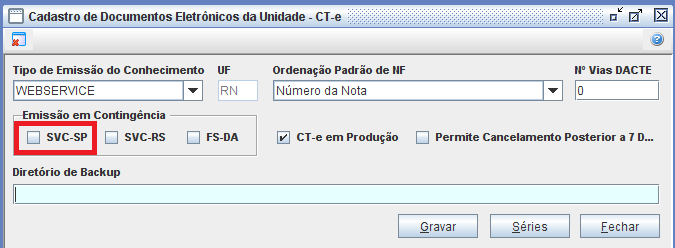 Importante: Durante o período que a Contingência estiver ativada, não será possível Aprovar conhecimentos Complementares e nem realizar o Cancelamento de CT-es.