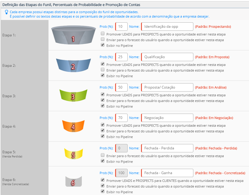 3. Altere de acordo com o desejado o funil em Definição das Etapas do Funil, Percentuais de Probabilidade e Promoção de Contas: