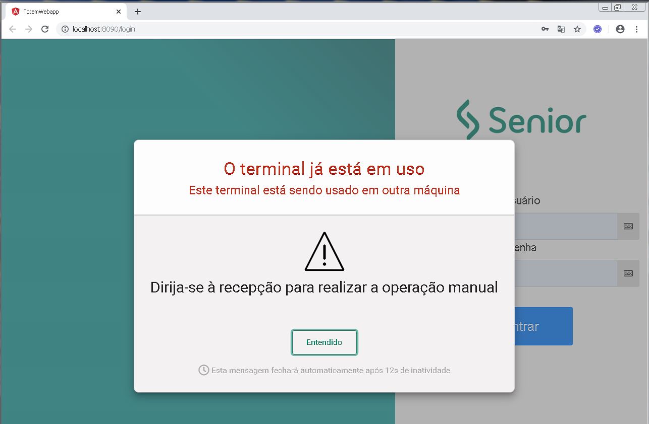 Esta mensagem é apresentada, pois as informações de identificação do terminal, ficaram armazenadas indevidamente no cache ou no Local Storage do navegador, ou o arquivo de configuração local do Totem não foi limpo. O sistema entende que o terminal é acessado simultaneamente em duas máquinas.