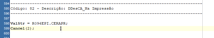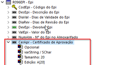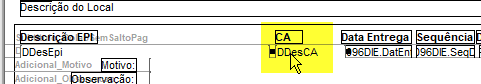 A regra do relatório busca o valor contido no campo CerApr da tabela R096EPI para gravar o valor no campo CA do relatório: